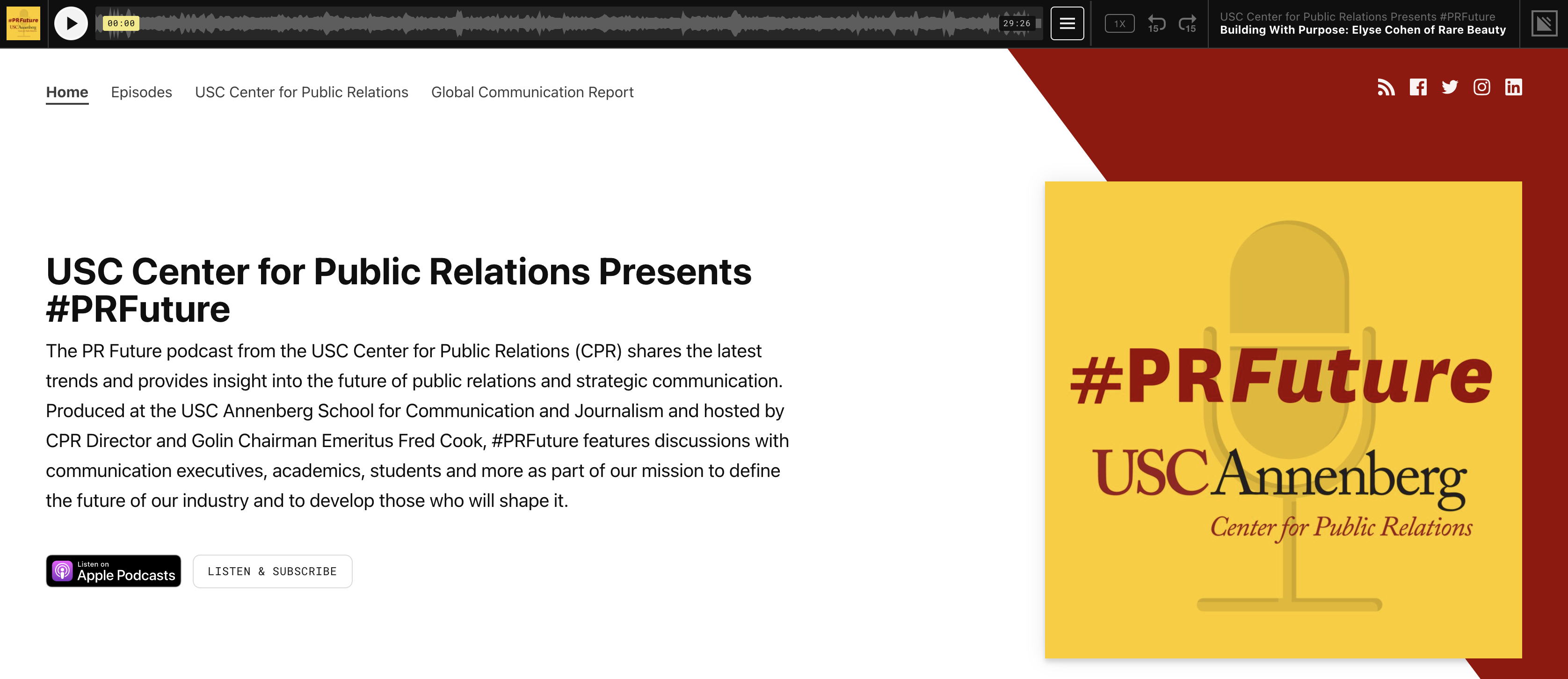 As a co-creator and the executive producer of the #PRFuture podcast, I created the podcast’s visual image to align with the USC Center For Public Relations, including the cover art (at right), social media content and web layouts and copy.